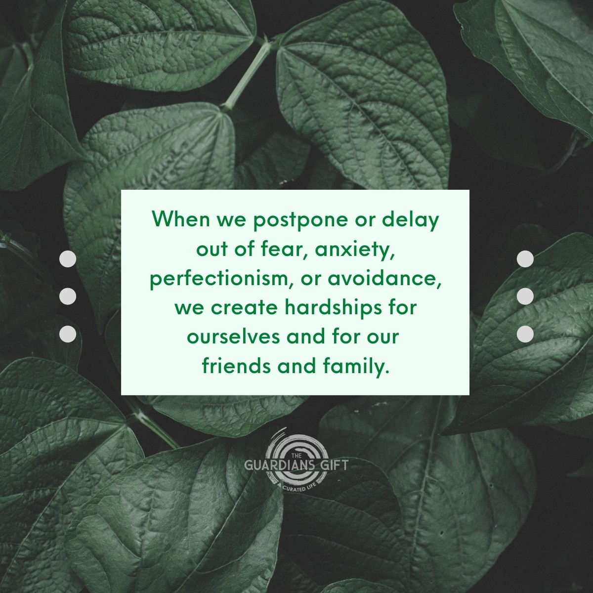 When we postpone or delay out of fear, anxiety, perfectionism, or avoidance, we create hardships for ourselves and for our friends and family. “It’s self-harm,” said Dr. Piers Steel, a professor of motivational psychology at the University of Calgary and the author of “The Procrastination Equation: How to Stop Putting Things Off and Start Getting Stuff Done.”